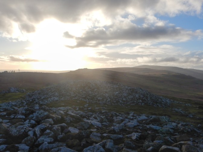 I cut a corner to return to the main ridge. This is “The Golden Road” used as an ancient highway for transporting gold mined on the east coast of Ireland to the south of England. Over its eight mile length there are opportunities for tremendous views over the surrounding countryside. In fact the weather was continuing to improve and I could even see back to Foel Cwmcerwyn which had previously been in cloud.