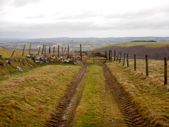 I ascended along a narrow lane out of the town. A woman overtook me in her car and then I passed her as she stood at a field gateway checking her sheep. She passed the time of day and commented that it wasn’t a great day for a walk. However the visibility was actually reasonable and I had views back towards the town behind and hills ahead as I continued to climb on a track past a farm and then on field footpaths.