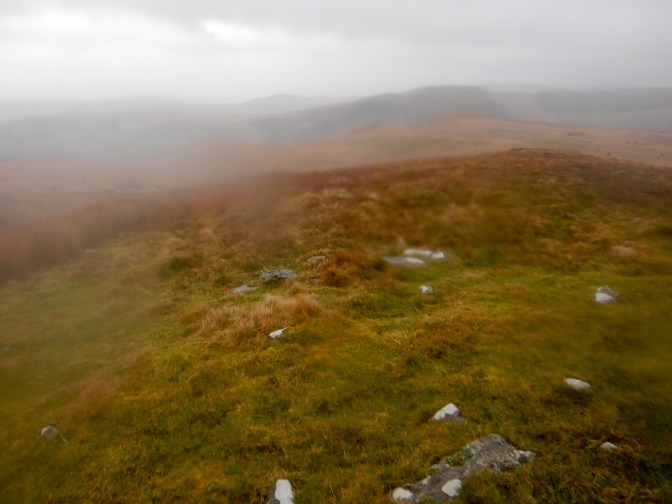 It became more windy as I reached the open ground but the rain eased somewhat. I had to stop to replace my attached rucksack rain cover which was flapping uselessly as a strong gust pulled it off. I cinched the drawstring on more tightly this time.
