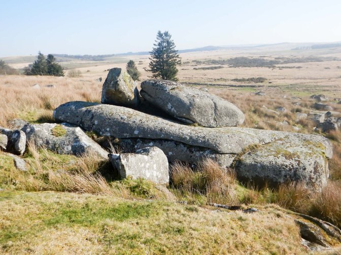 Sharpitor is a huge nearby outcrop that I have also visited in the past so I descended over springy grassland to cross the B3212, cross more grassy moorland and exit through a field to reach an old grassy lane leading to a small surfaced lane near Gipsy Rock. Gipsy Rock isn’t named on the OS map but it is thought to have been the meeting place of the Walkhampton Hundred (administrative division) in Saxon times (thanks to https://www.torsofdartmoor.co.uk/tor-page.php?tor=gipsy-rock for this information).