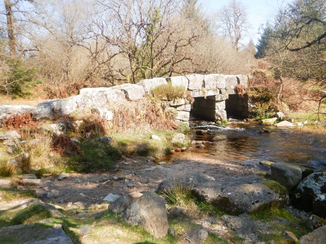 Some more tracks led to Leather Tor bridge, where I sat on a conveniently placed tree trunk to eat an early lunch. It’s a solid clapper bridge with two openings over the River Meavy, built in 1833 to serve the ancient farms of Leathertor, Riddipit and Nosworthy.