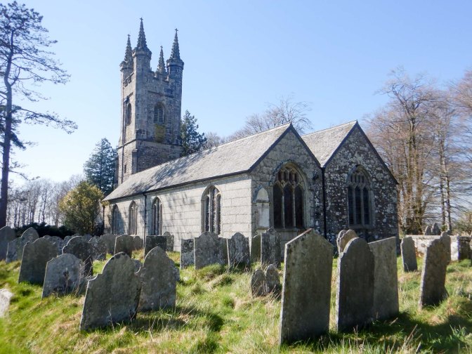 The fact that the church is half a mile from the village suggests that it predates the village and was built to serve the surrounding farms and as a place of prayer on the Monks Path. The current granite building with four prominent pinnacles on its tower is Grade I listed and dates from the 15th century. Unlike most churches which face east, it faces north-east, the direction of the rising sun on the longest day. Gipsy Rock is on this alignment so might be linked with the church site.