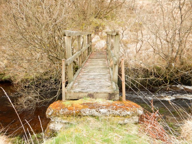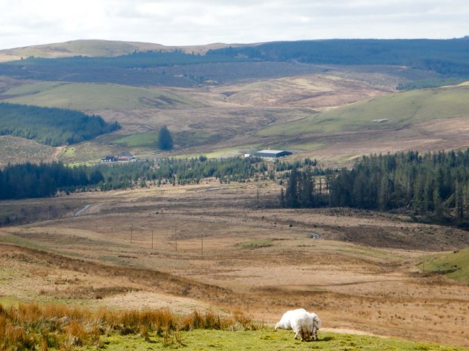 My first “all day” outing started by crossing the Doethie Fawr on a footbridge only a few hundred metres from the hostel. I followed a path which became indistinct in the woodland. There were views back over the valley. I crossed a main track and then squeezed between planted trees to emerge on moorland. I definitely strayed from the path on to animal tracks and pathless sections but still left the moorland at a bridle path sign near Bryn Ambor Farm as I had planned.