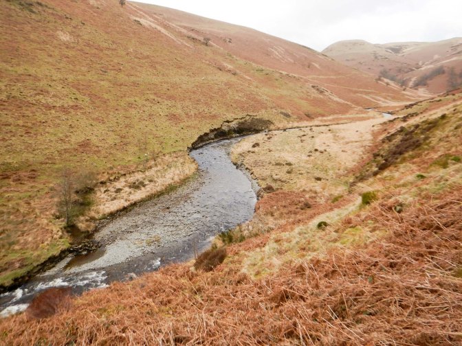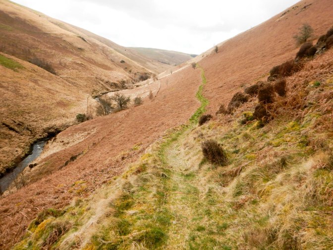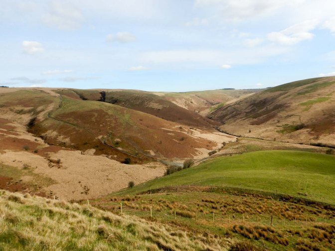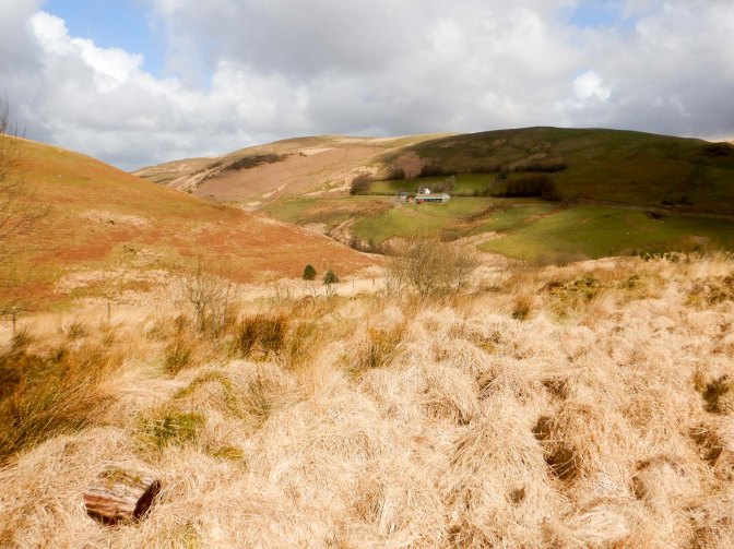 My walk continued on the balcony footpath overlooking the extremely scenic Doethie Valley with its multiple interlocking spurs, small rapids and waterfalls and some old ruined farms. There are a few fallen trees providing little obstacle to me carrying only a day rucksack and a few wet, marshy patches but overall at this time of year the path is well demarcated on the ground because the bracken hasn’t grown up yet.