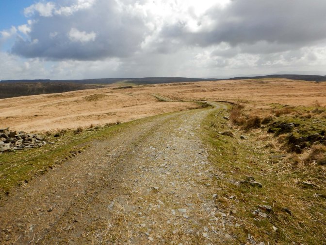 There followed a steep uphill then a stunning walk along an airy track with superb views of the nearby moor and distant mountains past cairns and a standing stone.
