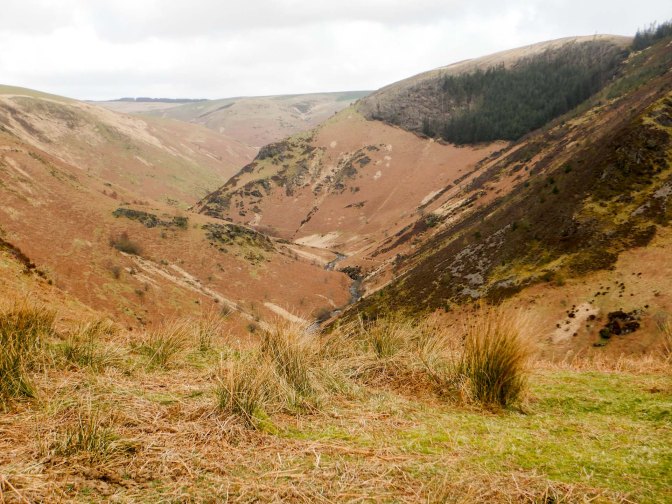 Descent towards Ty’n Cornel – view along Doethie Valley on right and the old drove road to Soar y Mynydd to the left