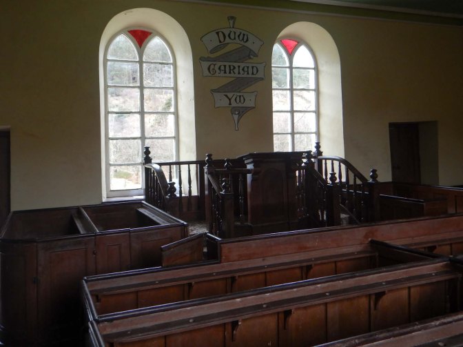 There was no-one else there so I sat in one of the box pews, contemplating the words “DUW GARIAD YW” – “God is Love” painted above the preacher’s dais. There is no cross and little other ornamentation in this simple Calvinistic chapel.