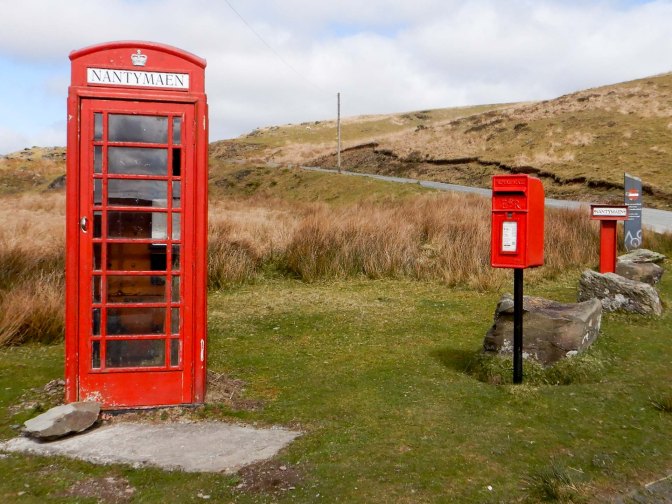 While en route I was tempted to detour to the hills to the east (Llethr Llywelyn, Cyrnau and the trig point at Esgair Hir). However the path I followed was extremely pleasant and nowhere near as boggy as its reputation so I continued and eventually saw the iconic isolated telephone kiosk at the road junction to Nantymaen.